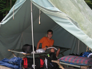 Well, Noah has been having a great time at Boy Scout camp this week. (That’s him in his tent above.) This has been such a good experience for him — hanging out with friends, working on merit badges, sitting around the camp fire, swimming in the lake, and generally challenging himself to do things he’s never done before. I’m sure it wasn’t easy for him to be away from home for a week. I know it wasn’t easy for me to have him away from home for a week, especially when the phone rings and Noah is on the other end asking for advice on his pocket-knife injury. Fortunately, it was very minor. Still, the thought of my boy in the woods with a knife on his belt or at the archery range with an arrow in his hand is a bit frightening. After all, this is the boy who used to fall down spontaneously while just walking across the room.
