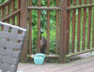 About a week ago I noticed a big, fat woodchuck near the end of our deck, nibbling on a weeping mulberry tree. (That’s him in the somewhat blurry photo to the left.) I’ve seen him running here and there over the past few days and noticed a big hole dug out near the base of our deck, so I’m guessing he’s living underneath. I found it all kind of cute and back-to-nature-ish until I went outside and realized that the little beast ate all of my green leaf lettuce, even the thin, pale stuff, and my parsley and the tops of my beautiful red astilbes. I’m guessing it’s him because no other animal has been brazen enough to come up on our deck for grub and astible are deer resistant, which is why I planted it in our deer-infested yard. Now what? This thing is too big to trap in the Have-a-Heart box we have. Any suggestions?