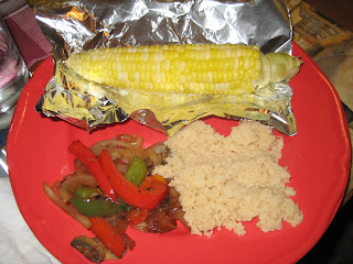 Place corn in a piece of aluminum foil. Add some butter and salt. Roll or twist corn in foil. Voila! Perfectly buttered and salted corn. Yum. And no mess. Go get you some. That’s whole wheat couscous and sauteed peppers, onions and mushrooms on the side. The corn was from the Catskills, and it was quite tasty for so early in the year.