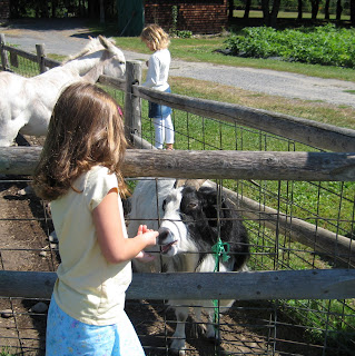 Chiara loved her first real turn in the apple fields, chomping away on a juicy red Mac as she looked for fruit hanging within her reach. What a way to end the summer. We headed over to the main farm before leaving and took some time to feed the goats and donkey and chickens. Chiara thought the one rooster looked “like Little Bear’s hen.” She wouldn’t get anywhere near close enough to the goats to feed them, although she did like the bid red tractor in the giant sandbox.