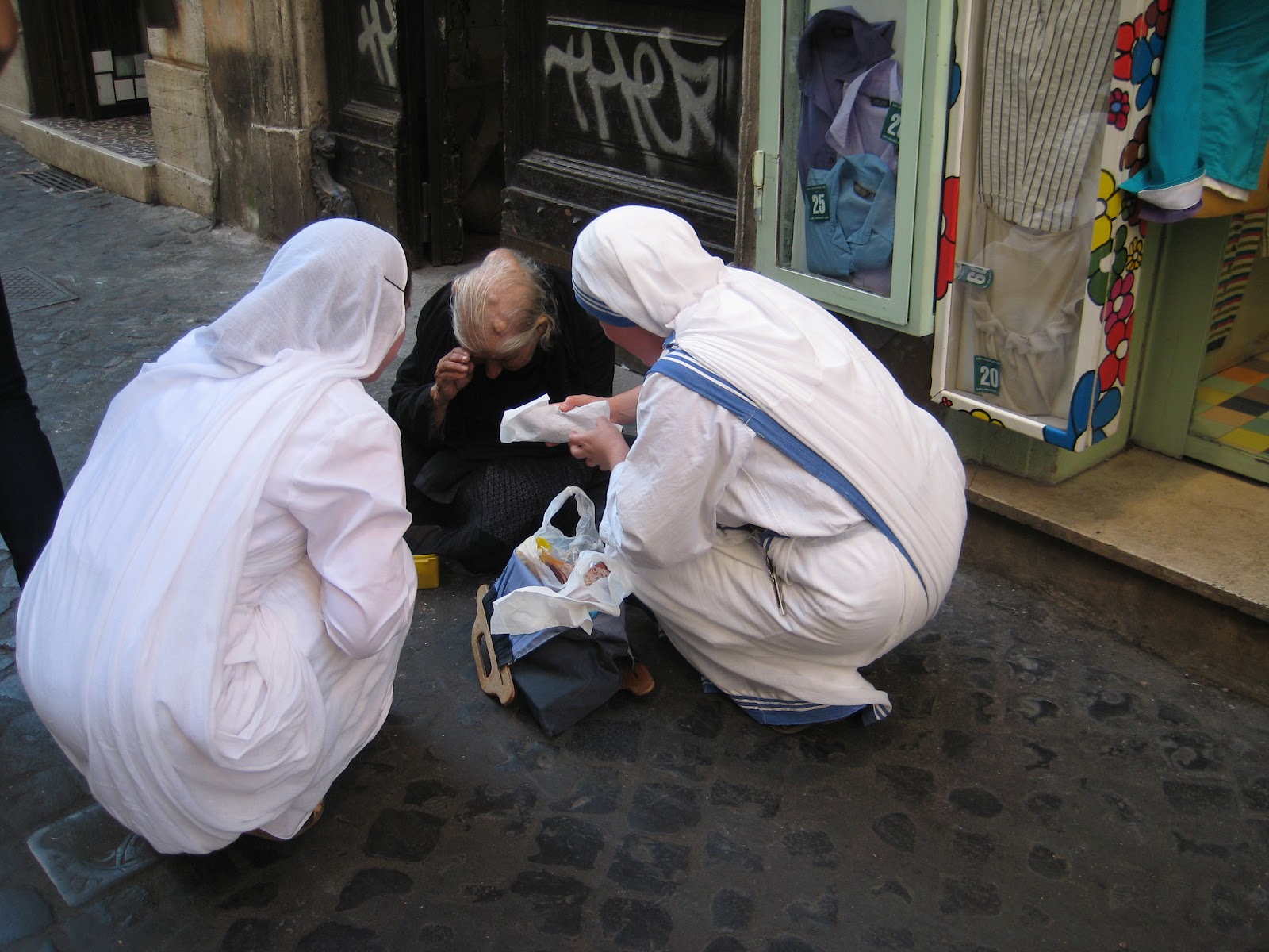On this feast day for Blessed Mother Teresa, I got to thinking about Mother Teresa moments in my life. The photo above is one. I had just arrived in Rome and was a little lost, when I came upon these two Missionaries of Charity. They were walking down the street, saw this homeless man and immediately knelt down beside him, took pizza bianca from their bags, and gave it to him with such tenderness and care. Of all the basilicas and great works of art I captured on camera during that trip, this image remains one of my favorites from my time in Rome.